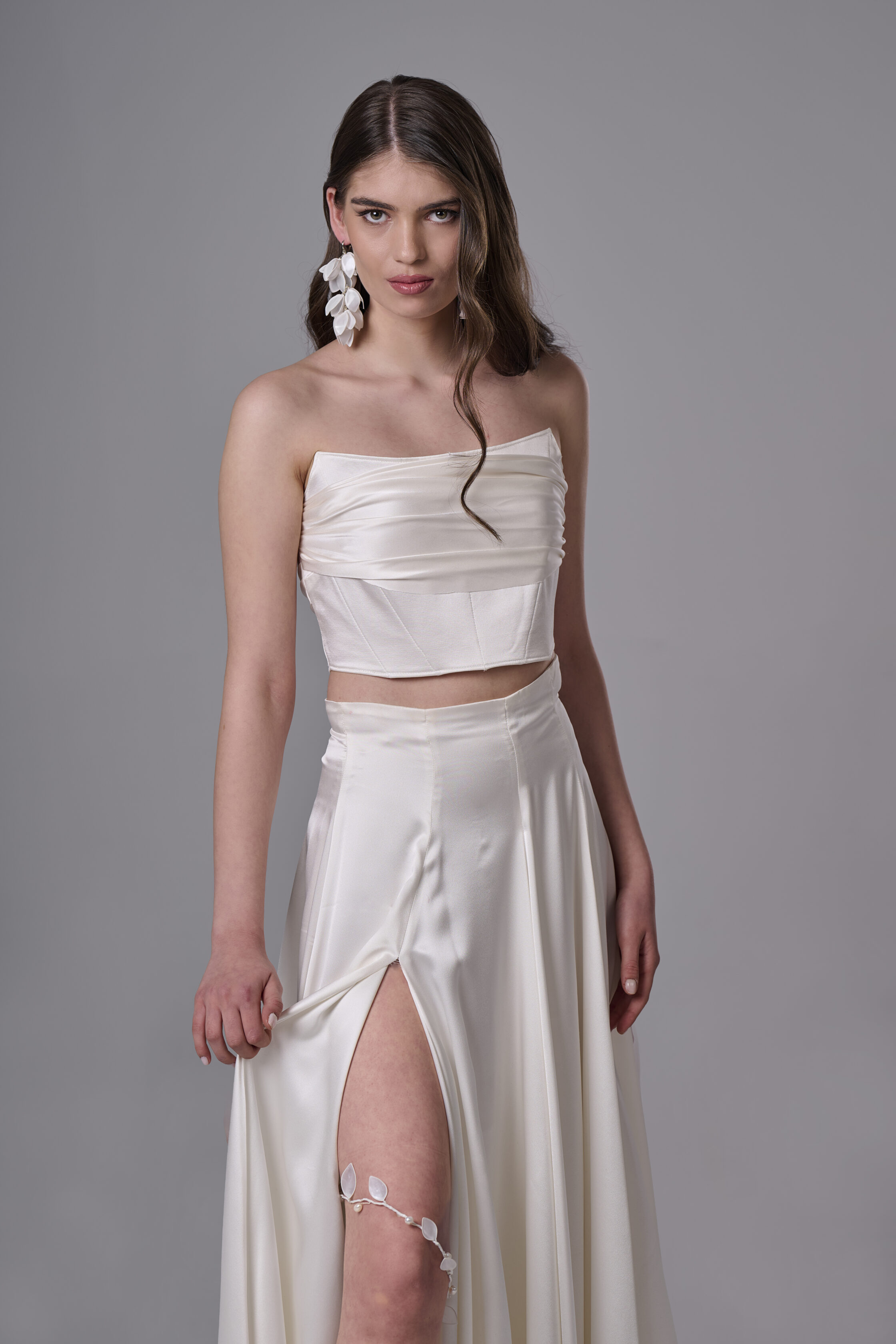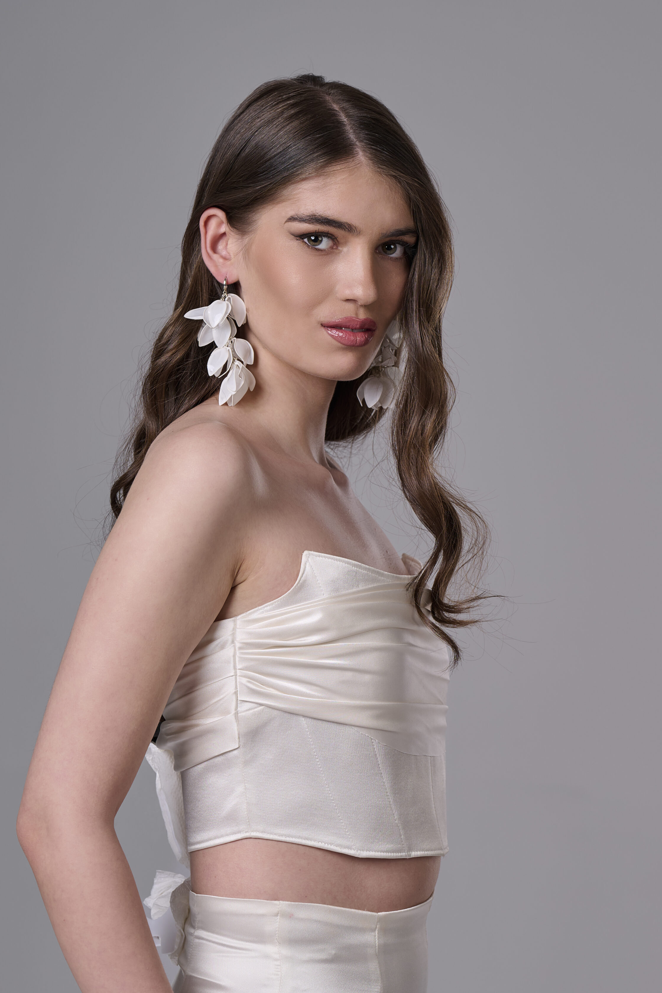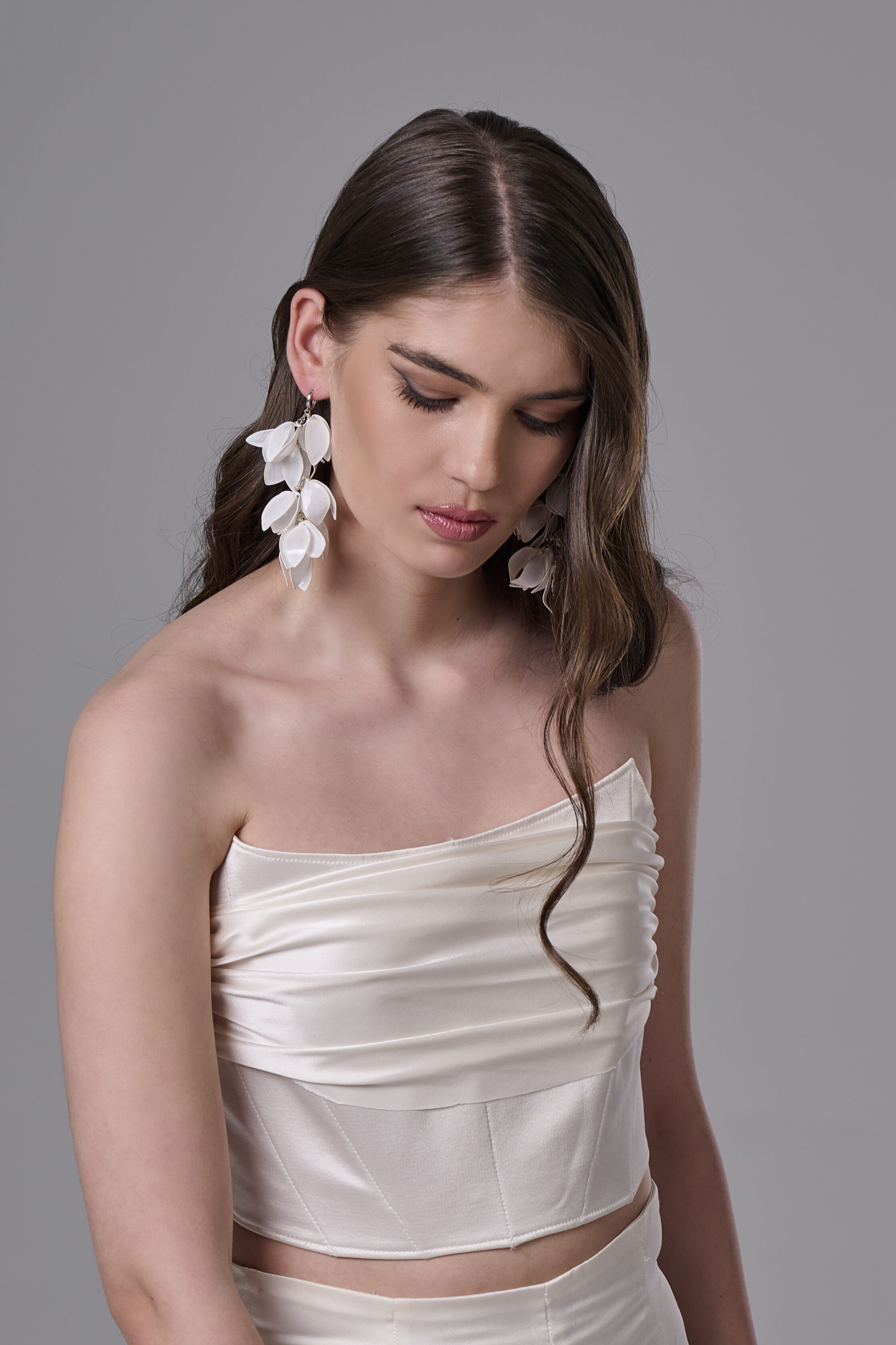 Ефирни и артистични висящи обеци „Габриела“, създадени за бохо визии с естествено излъчване и свобода в детайла. Белите цветя със заострени краища придават органична форма и леко суров акцент, вдъхновен от природата и ръчното изкуство.