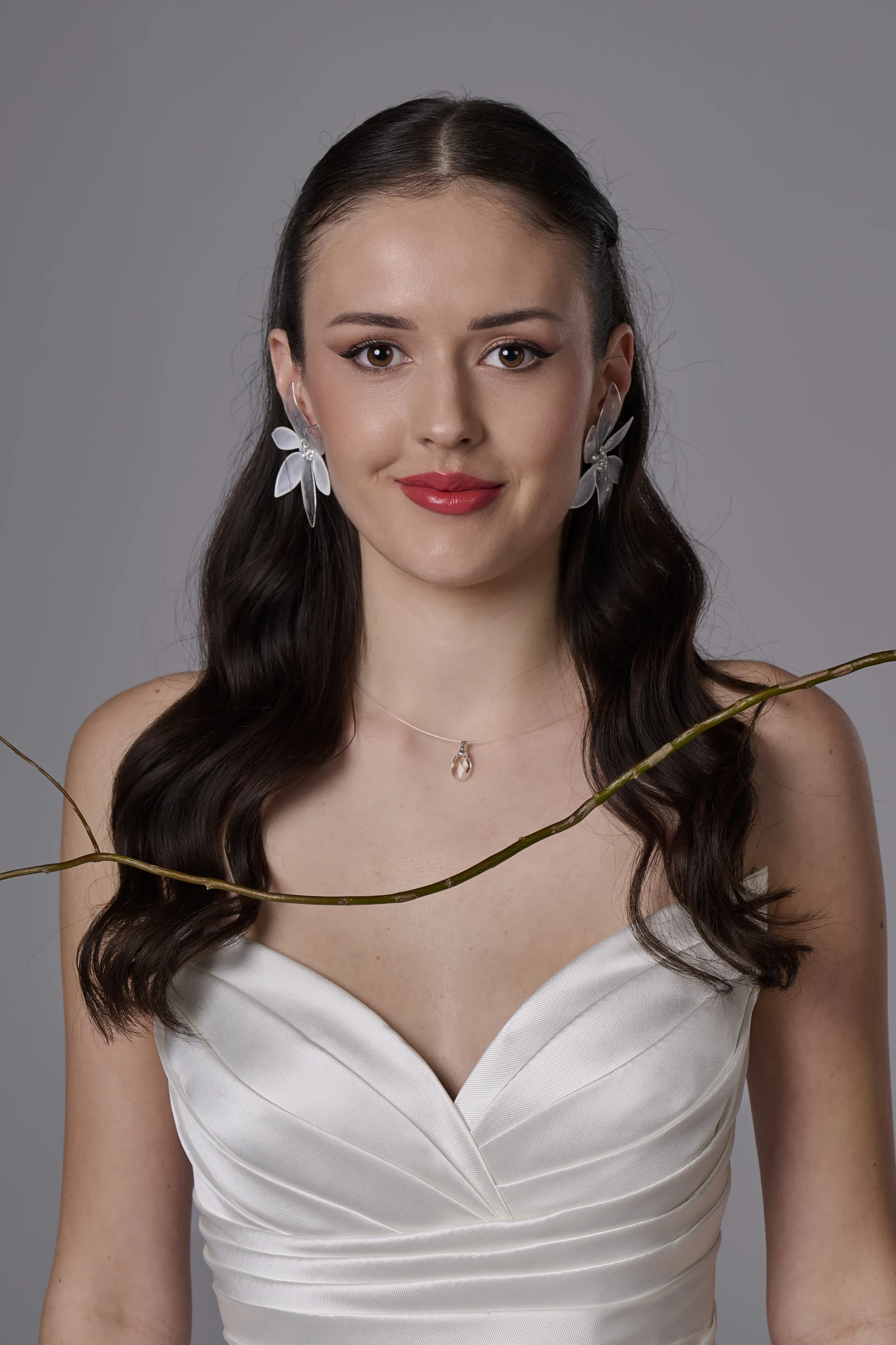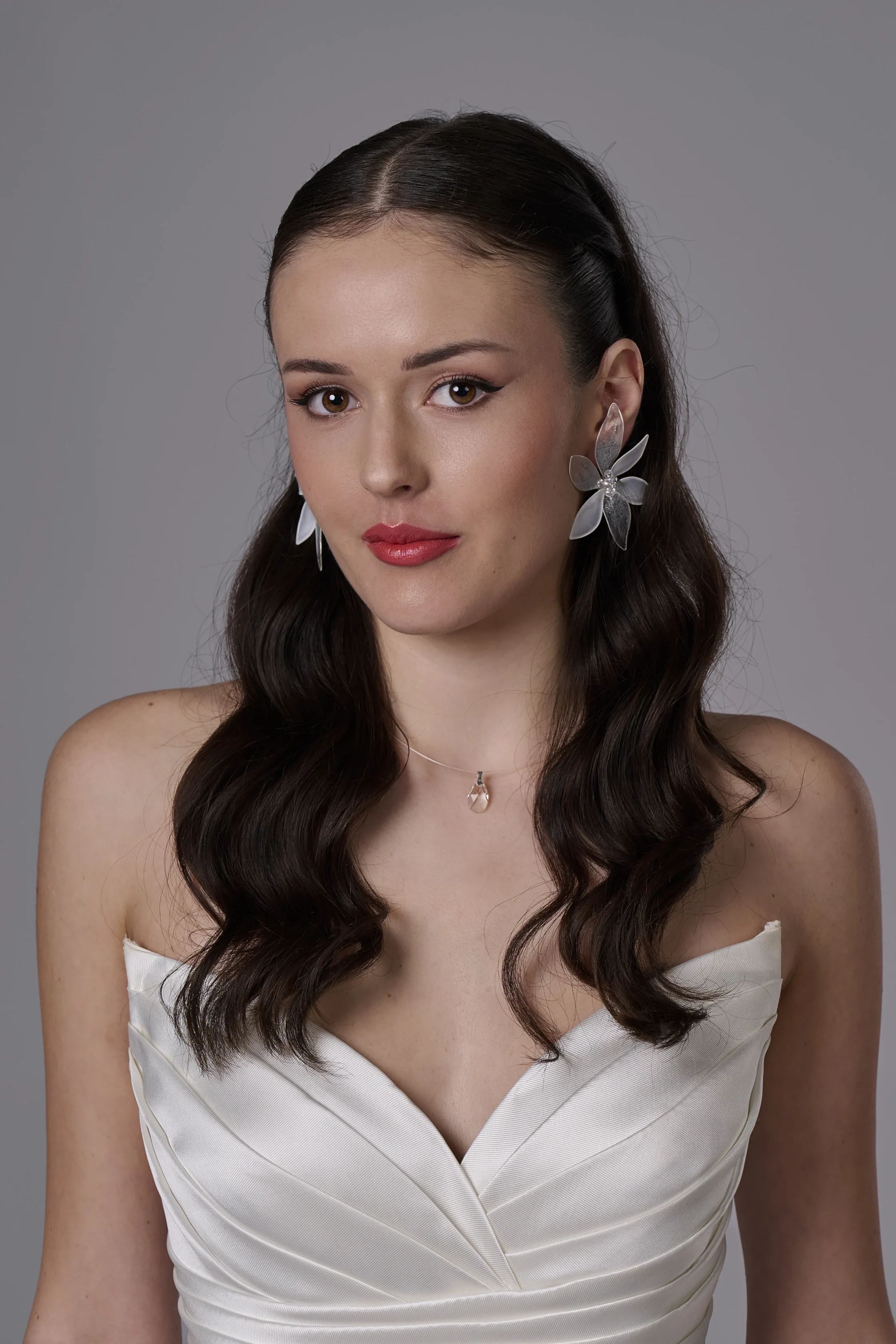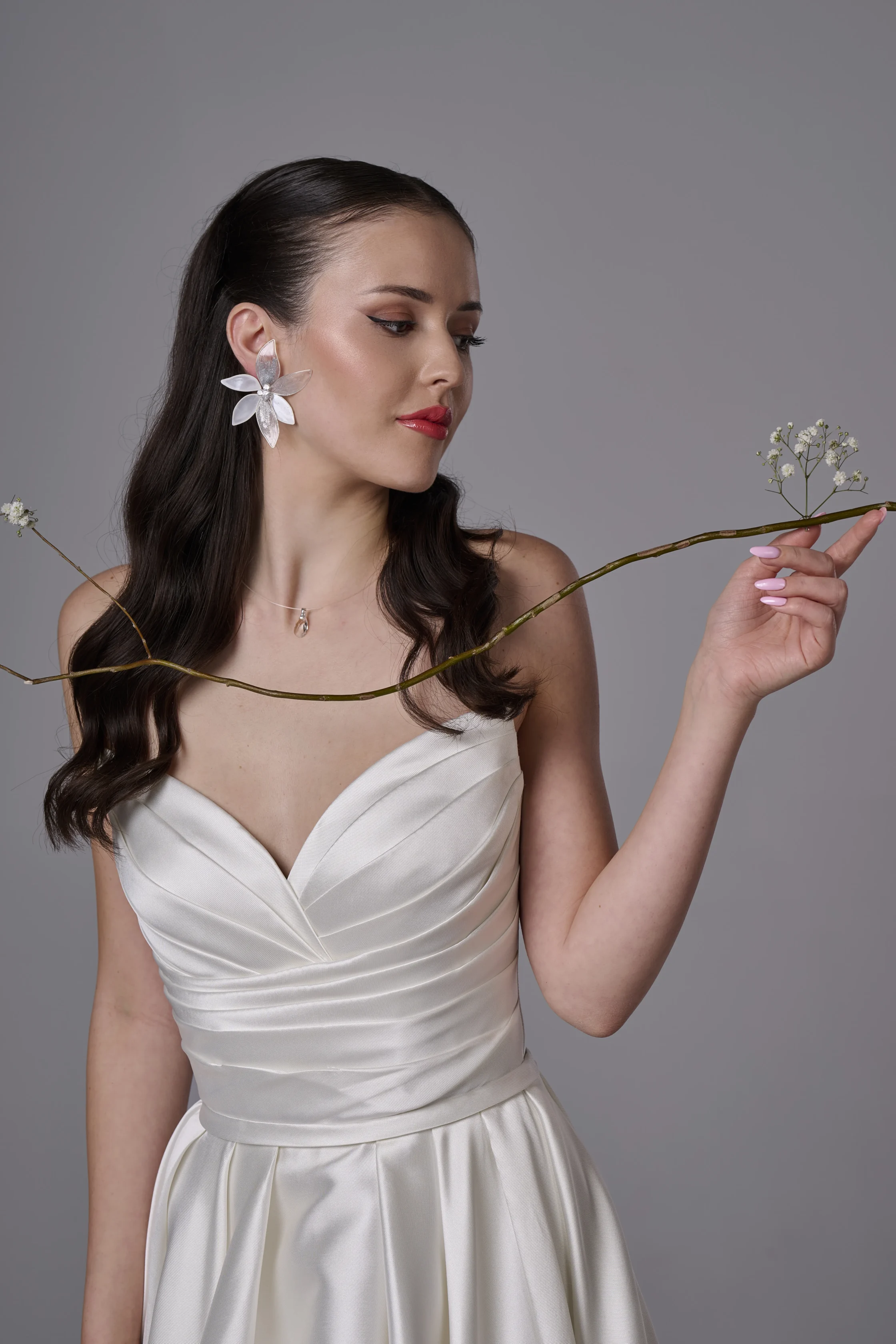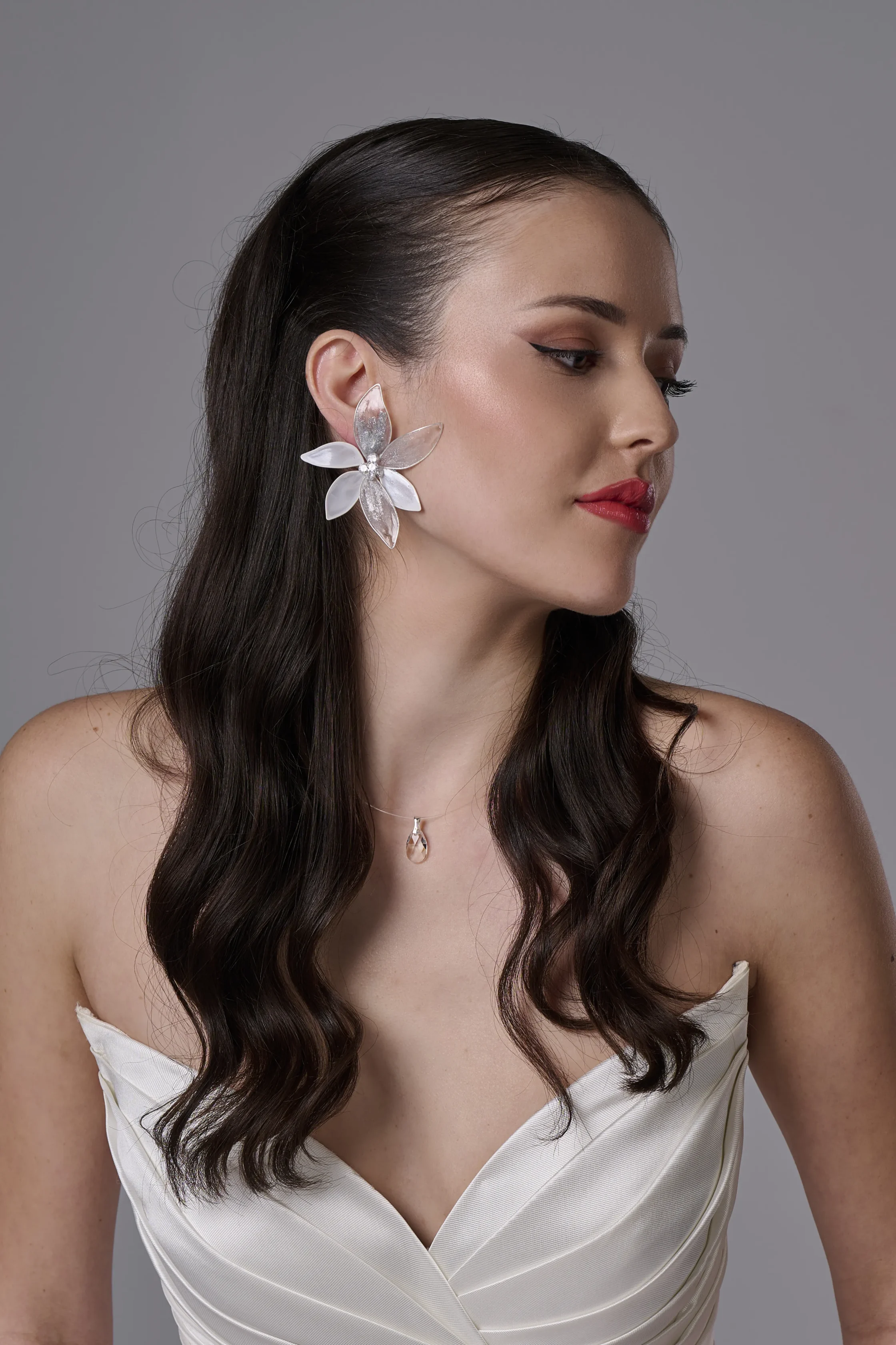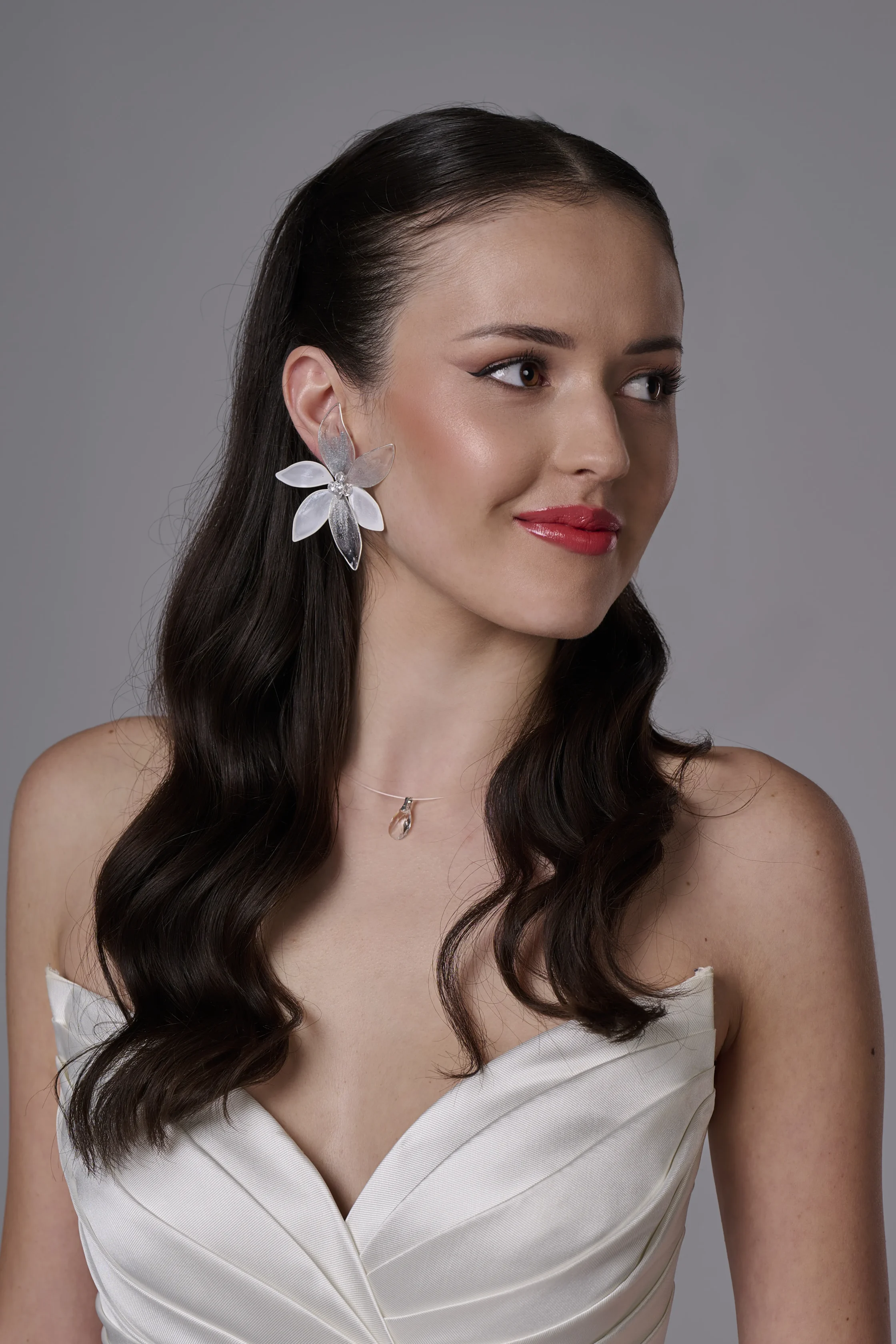 Красиви обеци с артистично цвете, които нежно обгръщат ухото и създават ефектна, но изискана визия. Дизайнът съчетава бели листа от цветето и прозрачно кристални листа, декорирани със сребърни пръски, които придават лекота, блясък и артистичен характер на бижуто.