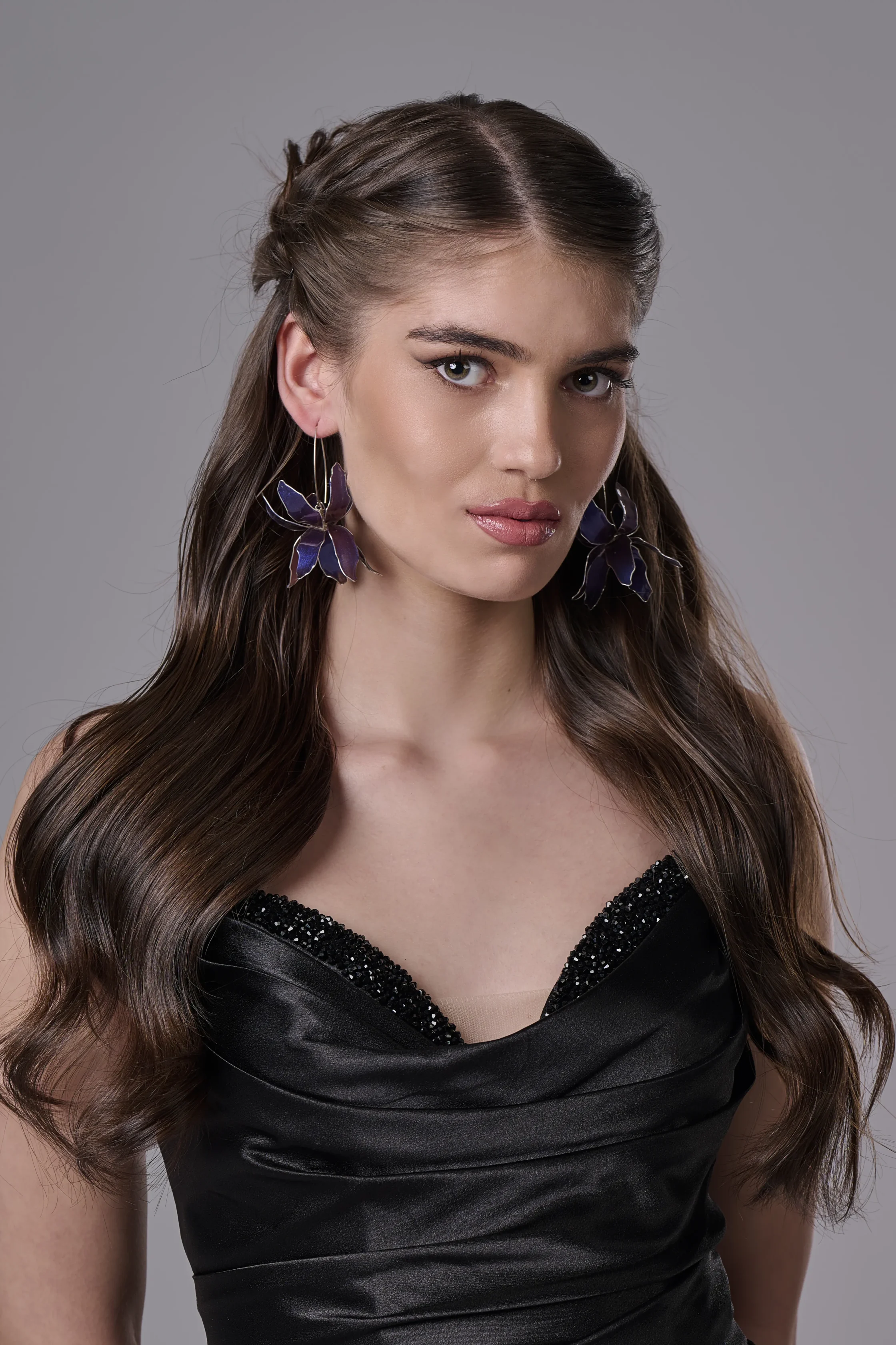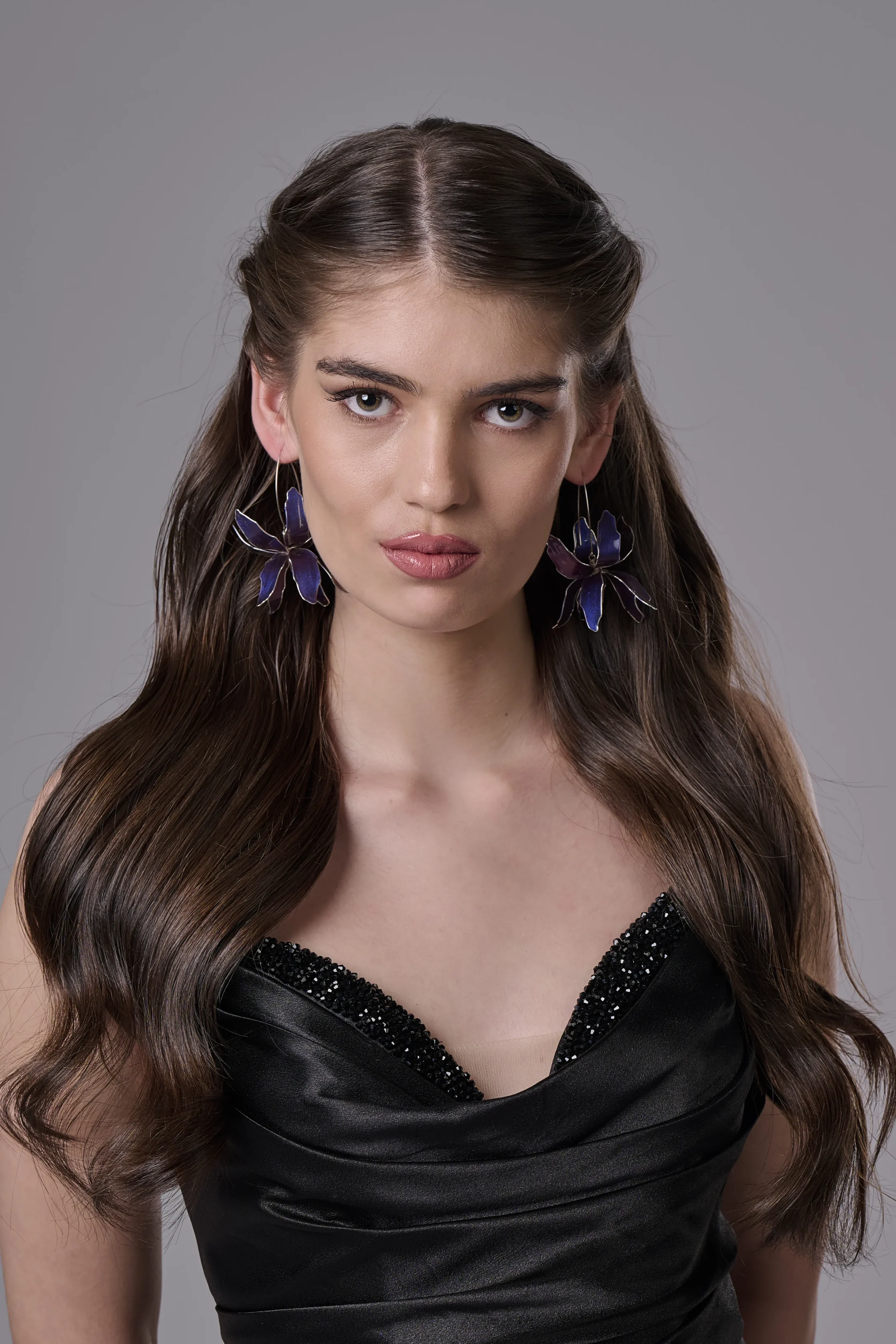 Ако търсите ръчно изработени лилави обеци с цвете, които да бъдат едновременно елегантни и запомнящи се, моделът „Ирис“ с хамелеонов ефект е перфектният избор.