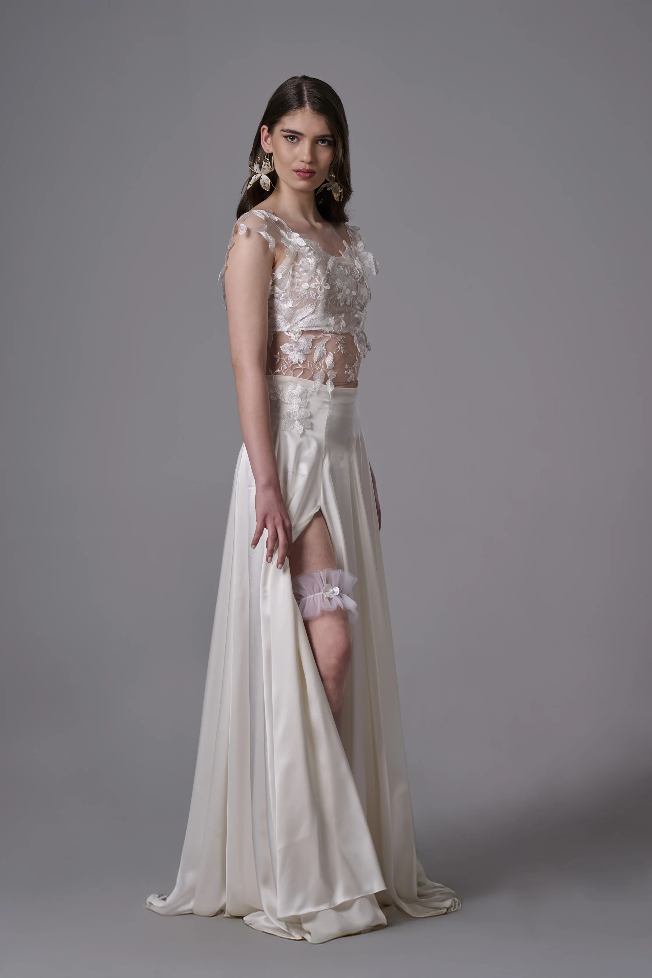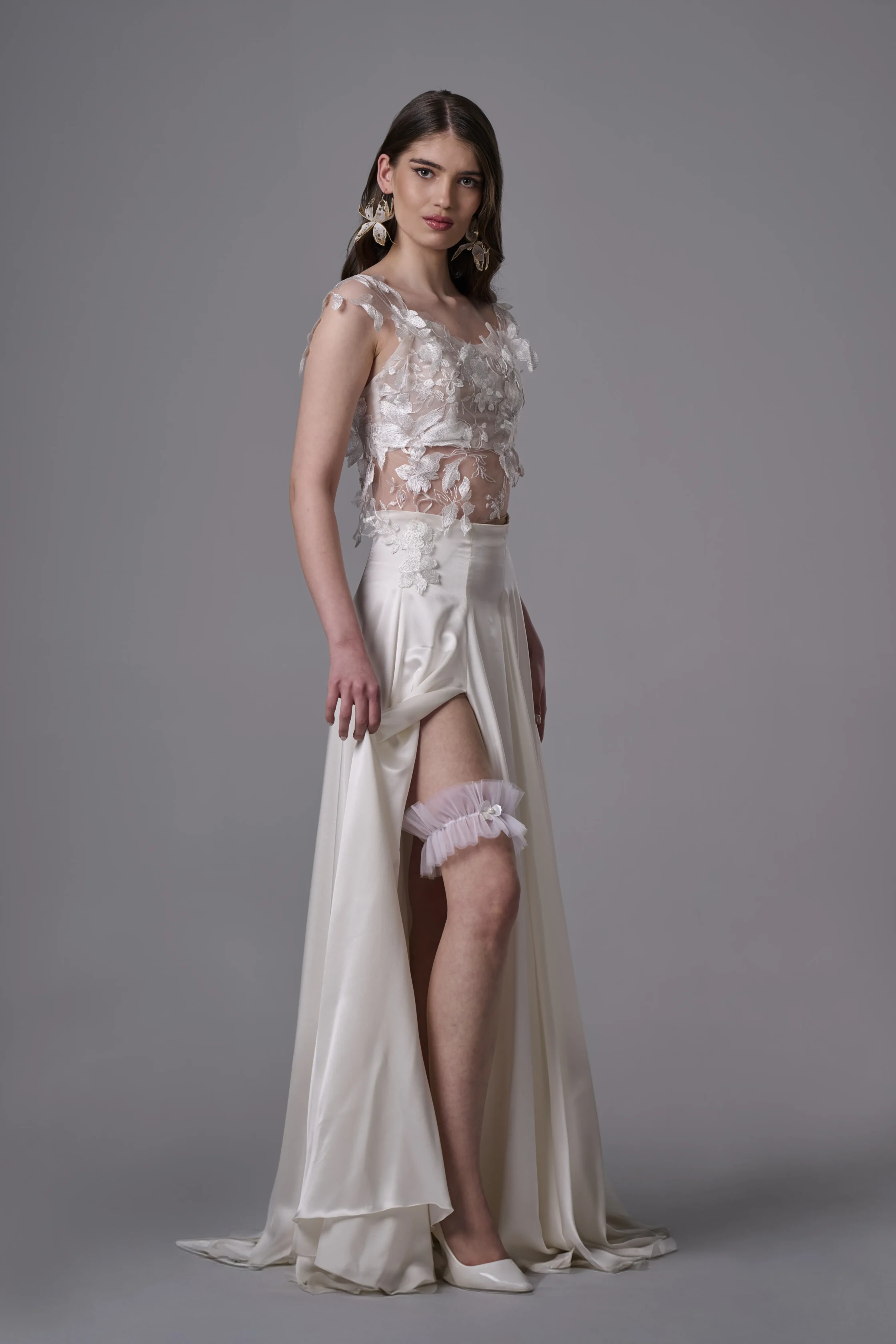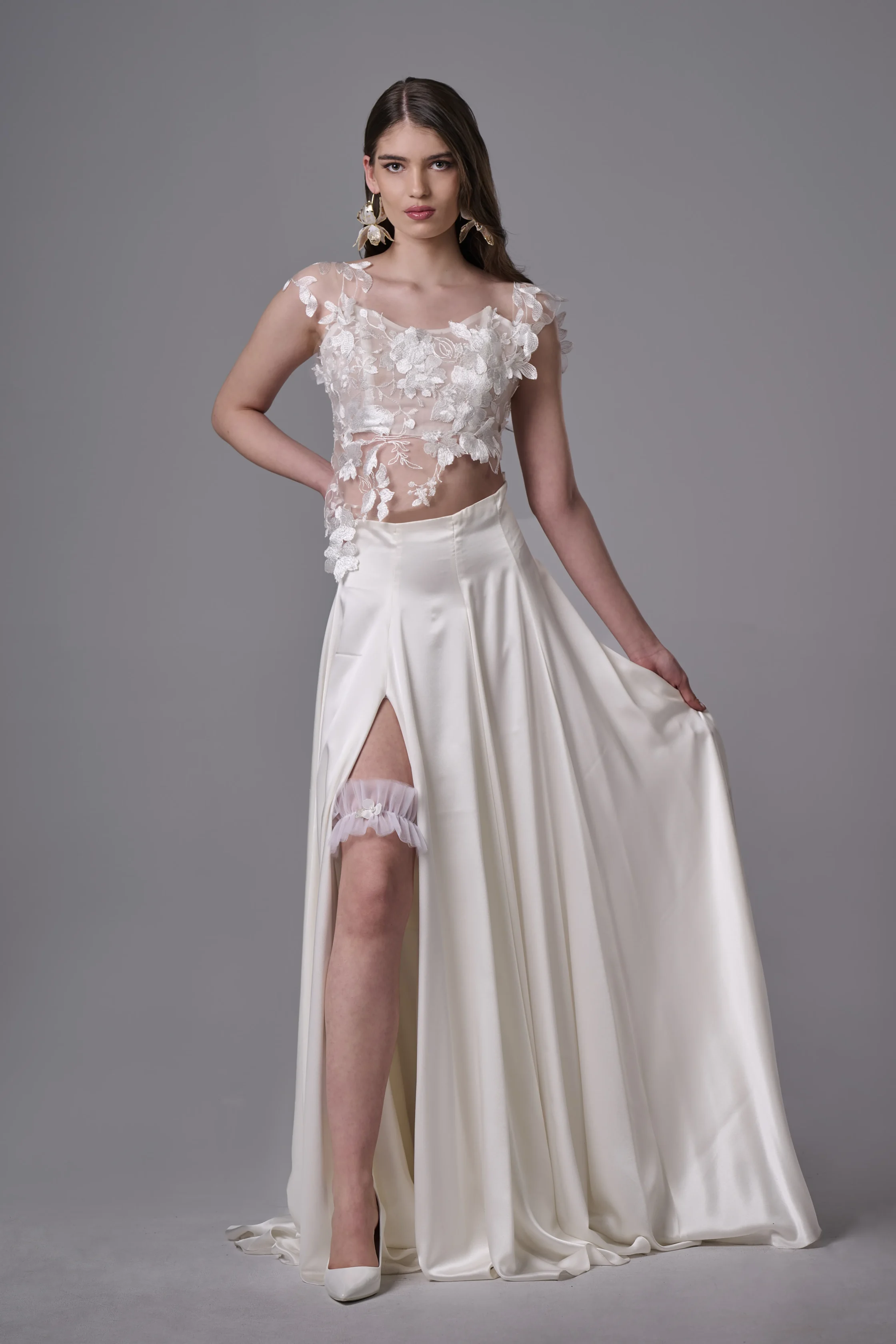 Жартиерът е изработен от мек и ефирен тюл, който прилепва деликатно към крака, без да стяга или да създава дискомфорт. Основният акцент е бяло цвете, символ на чистота, нежност и ново начало. Цветето е внимателно оформено и придава романтично излъчване на цялостния дизайн.